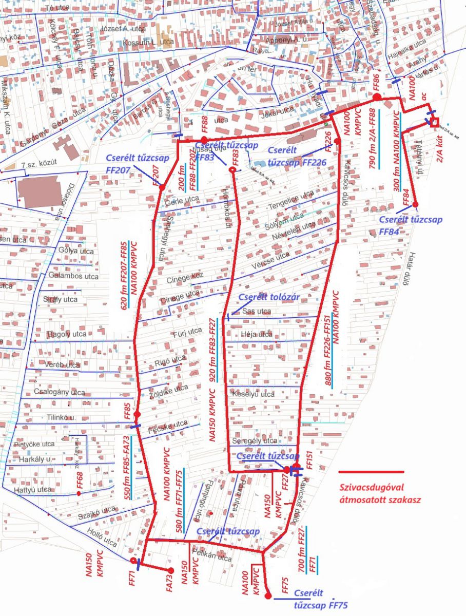 Az elvégzett szerelvény cseréket és a kitisztított vízvezeték szakaszokat a mellékelt térképkivonaton megjelöltük.